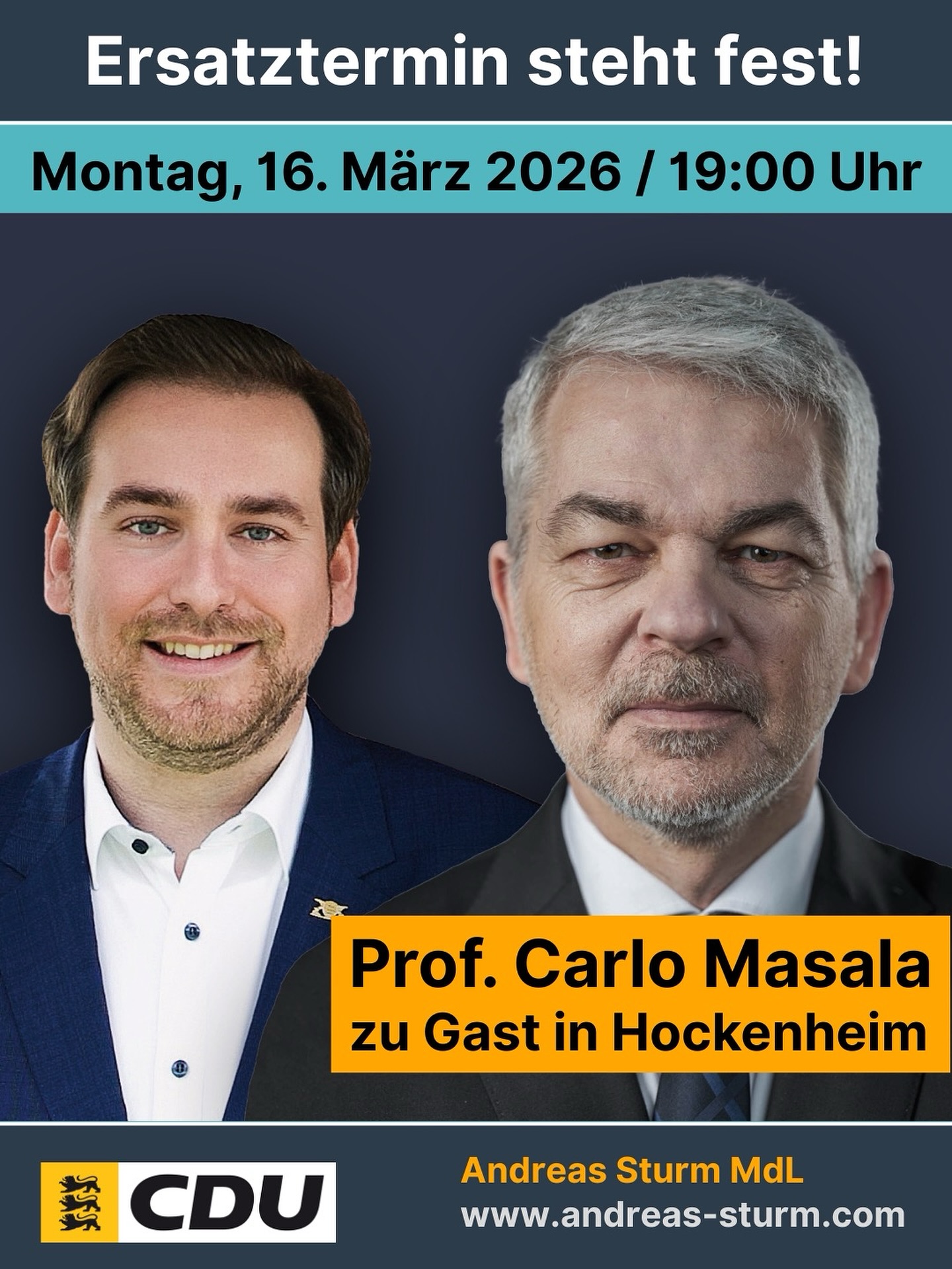 💬Militärexperte Prof. Carlo Masala kommt nach #Hockenheim / Neuer Termin steht fest 🗓️ 🎤 Die ursprünglich für Juli geplante Veranstaltung mit Professor Carlo Masala, die aufgrund einer Erkrankung von Herrn Masala abgesagt werden musste, wird nachgeholt. Der CDU-Landtagsabgeordnete Andreas Sturm, der den Militärexperten eingeladen hatte, teilt aktuell mit: "Ich hatte die Veranstaltung in Kooperation mit dem Gauß-Gymnasium in Hockenheim geplant, sie sollte ursprünglich in der dortigen Schulaula stattfinden. Aufgrund der sechsmonatigen Karenzzeit im Vorfeld der Landtagswahl, die für die Schule und die Stadt Hockenheim am 9. September begann, können wir die Veranstaltung nicht wie geplant in der Aula oder der Stadthalle durchführen. Gemeinsam mit Herrn Prof. Masala habe ich einen neuen Termin für Montag, 16. März 2026 vereinbart. 📝 Die erfolgten Zusagen für die Veranstaltung behalten ihre Gültigkeit. Neue Anmeldungen für die Warteliste sind weiterhin möglich. ☎️ Interessierte können sich per E-Mail an andreas.sturm@cdu.landtag-bw.de oder telefonisch unter 0711 20638310 gerne melden. 🤝 "Ich bitte um Verständnis dafür, dass die Veranstaltung erst Mitte März stattfinden kann. Nur so kann ich meine Zusage gegenüber dem Gauß-Gymnasium einhalten." #carlomasala #andreassturmmdl #politikwissenschaft