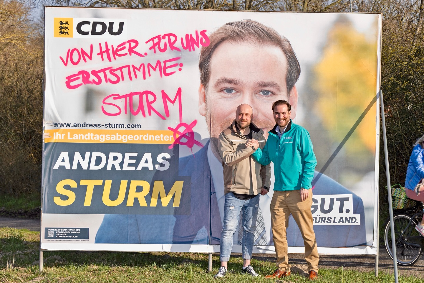 📍Von hier. Für uns. 🗳️ Erststimme: Sturm 🗳️ Zweitstimme: #CDU ?🎨 Der Künstler Domink Göhlich, alias Dominik Symanowski hat meine Großflächenplakate mit einer Botschaft für den Wahlsonntag versehen. 🙏 Vielen Dank! Bild: @matthias.busse
