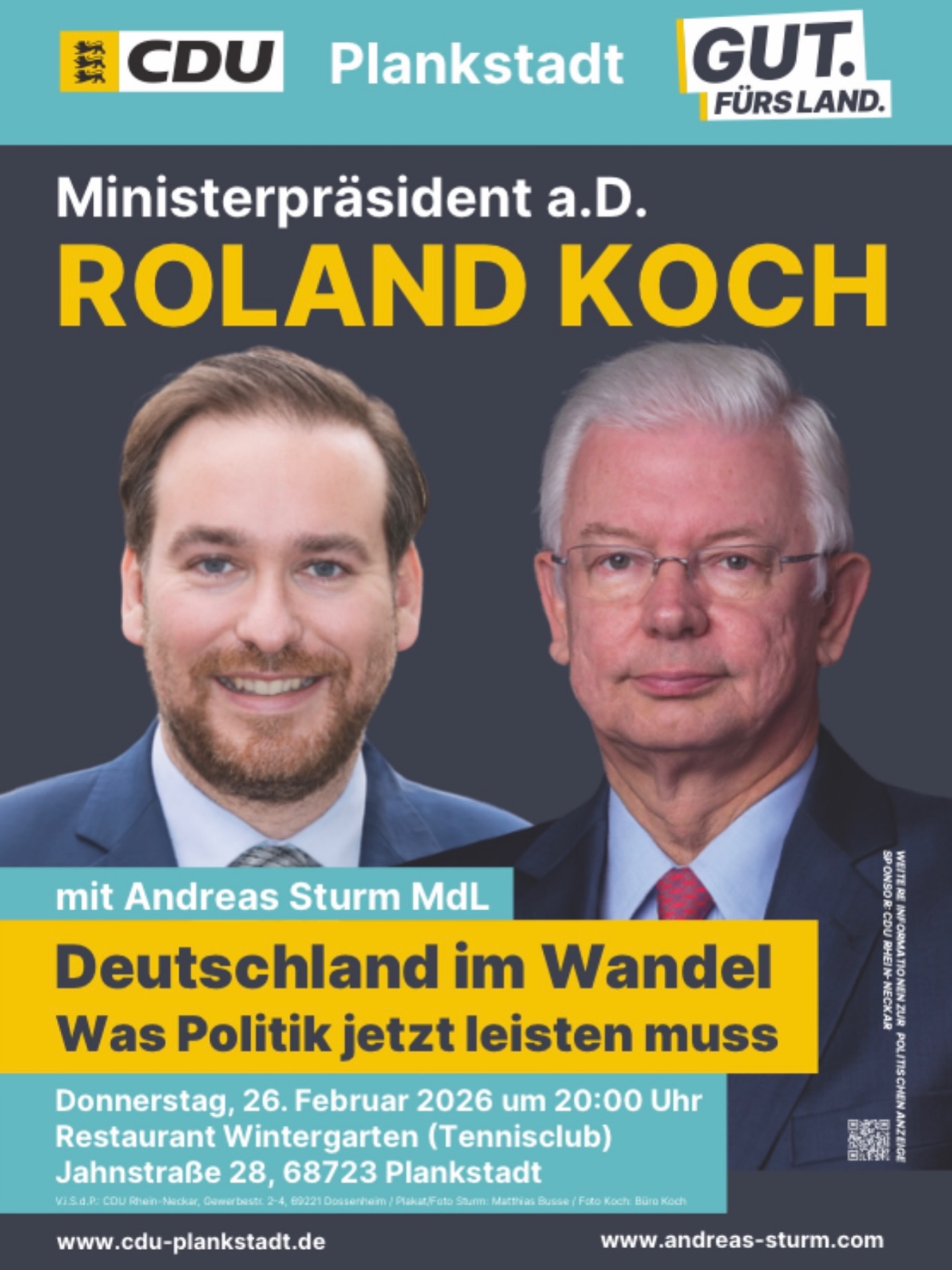 💬 Roland Koch spricht in #Plankstadt 📈 Auf Einladung der CDU Plankstadt und des #CDU-Landtagsabgeordneten Andreas Sturm kommt der frühere hessische Ministerpräsident Roland Koch nach Plankstadt. Koch war von 1999 bis 2010 erfolgreicher Regierungschef in Hessen, anschließend mehrere Jahre Vorstandsvorsitzender des Baukonzerns Bilfinger und ist seit 2017 Professor of Management Practice in Regulated Environments an der Frankfurt School of Finance & Management. 🗓️ Der ausgewiesene Wirtschaftsexperte spricht zum Thema: "Deutschland im Wandel: Was Politik jetzt leisten muss". Die Veranstaltung findet am Donnerstag, 26. Februar, 20 Uhr im Restaurant Wintergarten, Jahnstraße 28, in Plankstadt statt. ☎️ Da die Platzkapazität begrenzt ist, wird um Anmeldung gebeten: kontakt@andreas-sturm.com oder 0711 20638310. 💬 "Ich freue mich sehr, dass es gelungen ist, einen erfolgreichen Ministerpräsidenten mit Erfahrungen in der freien Wirtschaft für einen Vortrag zu gewinnen. Roland Koch verbindet politische Erfahrung mit wirtschaftlicher Kompetenz. Sein Vortrag wird wertvolle Anregungen geben, wie wir unser Land wieder auf Erfolgskurs bringen können. Ich freue mich auf einen Abend mit starken Gedanken und ehrlichen Antworten." Layout: Matthias Busse Restaurant-Wintergarten #andreassturmmdl