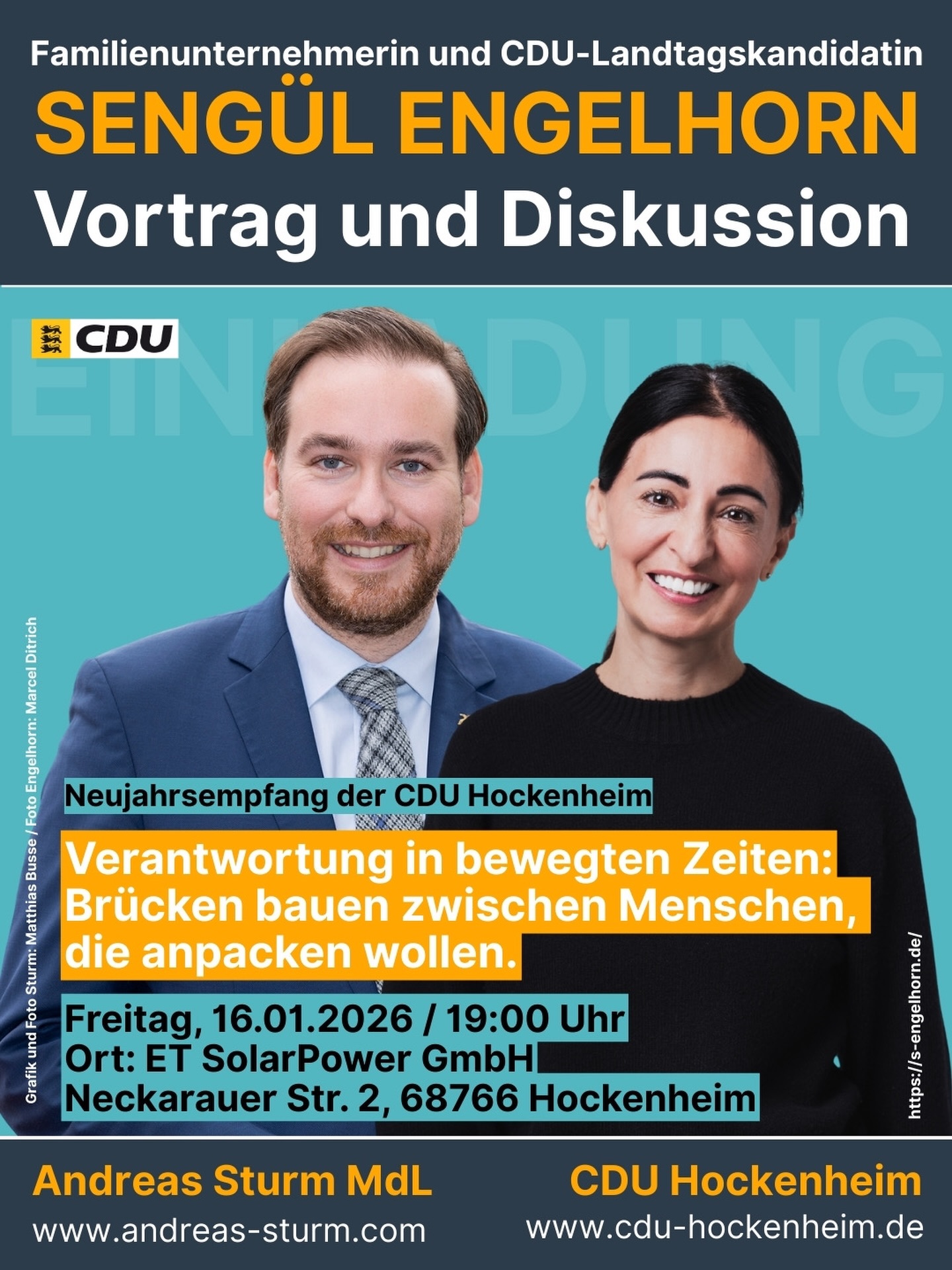 Sengül Engelhorn kommt statt Brockhaus nach #Hockenheim ? Vortrag zu "Verantwortung in bewegten Zeiten - Brücken bauen zwischen Menschen, die anpacken wollen" Für das Programm des traditionellen Neujahrsempfangs der CDU Hockenheim am Freitag, 16. Januar 2026, um 19:00 Uhr in den Räumlichkeiten der Firma ET SolarPower GmbH (Neckarauer Str. 2, 68766 Hockenheim) gibt es eine Änderung, da Bestsellerautorin und Fernsehmoderatorin Nena Brockhaus aus dringenden persönlichen Gründen ihre Lesung abgesagt hat. Der Landtagsabgeordnete Andreas Sturm (#CDU) freut sich sehr darüber, dass er kurzfristig Sengül Engelhorn für einen Impulsvortrag unter dem Titel "Verantwortung in bewegten Zeiten - Brücken bauen zwischen Menschen, die anpacken wollen" gewinnen konnte. Engelhorn ist CDU-Landtagskandidatin im Wahlkreis 36 (Mannheim-Süd) und Stadträtin in der Quadratestadt. Die studierte Dipl. Betriebswirtin ist Teil des traditionsreichen Familienunternehmens Engelhorn in Mannheim. Sie wird daher über die Herausforderungen für mittelständische Unternehmen in wirtschaftlich bewegten Zeiten sprechen. Geboren in der Türkei und aufgewachsen in Mannheim zwischen zwei Kulturen, wird Engelhorn auch über ihren eigenen Weg erzählen. "Mein Ziel ist immer: Brücken bauen zwischen Menschen, die anpacken wollen", so Engelhorn. Das Modehaus Engelhorn Mannheim steht seit mehr als 135 Jahren für regionale Verwurzelung und Verantwortung. Inzwischen beschäftigt das Mannheimer Unternehmen rund 1.000 Mitarbeiter. "Wir freuen uns sehr, dass es kurzfristig gelungen ist, Sengül Engelhorn für unseren Neujahrsempfang gewinnen zu können. Nach dem Vortrag mit anschließender Diskussion sind alle herzlich zu einem Empfang eingeladen", so der Vorsitzende der CDU Hockenheim, Patrick Stypa. Alle bisherigen Anmeldungen zum Neujahrsempfang bleiben gültig. Kurzentschlossene sind ebenfalls herzlich zur Veranstaltung willkommen. #hoggene