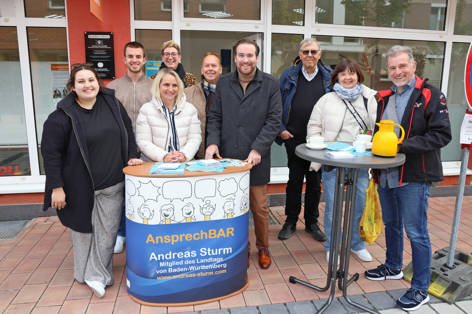 Großen Zuspruch fand auch das von Sturm initiierte Landtagsquiz, bei dem die Teilnehmer ihr Wissen über die Landespolitik unter Beweis stellen konnten. Wer wusste, seit wann Sturm dem Landtag angehört (2021), wer die CDU-Landtagsfraktion führt (Manuel Hagel) und wie der Amtssitz des Ministerpräsidenten heißt (Villa Reitzenstein), kam mit der richtigen Lösung in die Lostrommel. Am Ende entschied das Glück, denn zahlreiche Besucherinnen und Besucher hatten alle Fragen richtig beantwortet.